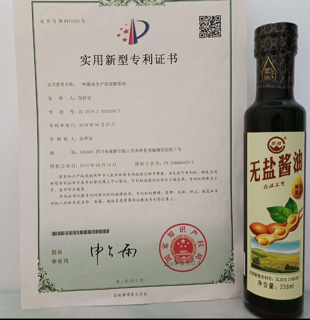 2019 年2 月12 日,“一种酿造生产用酱油发酵系统”获得国家专利。