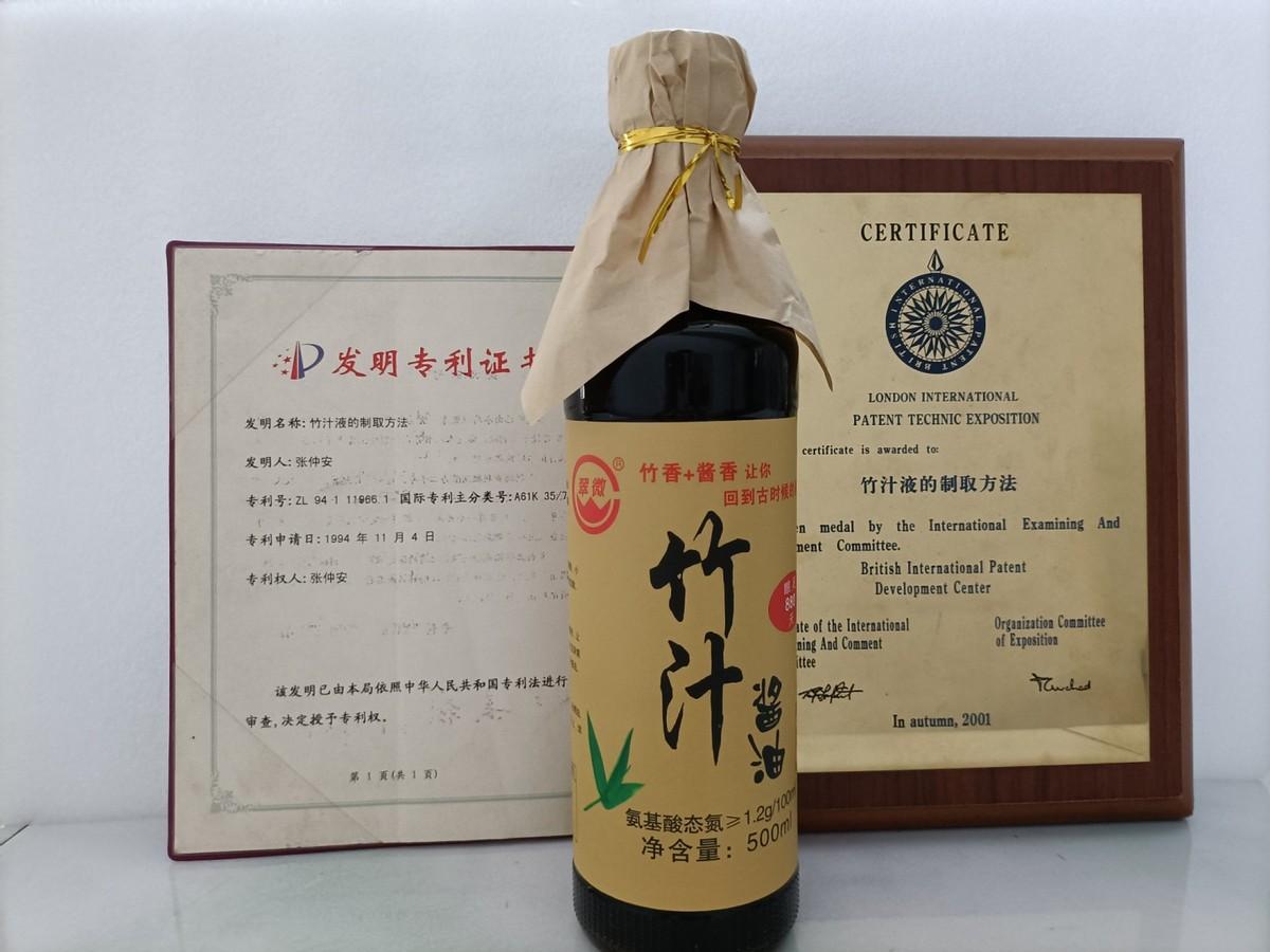 一等伤残军人张仲安的发明专利——竹汁液的提取(发明专利号:ZL94111966.1),在继竹汁液应用制“竹汁酒.竹汁饮品"项目被列入国家级星火计划项目"、被授予"伦敦国际专利技术成果博览会金牌奖”后,又创新性地广泛应用于酱油酿造,竹汁酱油是又一创新成果。